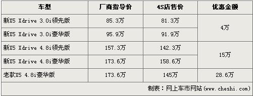 寶馬全新X5于去年7月上市,此車的上市為競爭激烈的高性能運動型多功能車(SAV)細分市場再次在操縱靈活性方面制定起新的標準。全新寶馬共有3.0L及4.8L兩個排量選擇,價格區間為83.7萬元-173.6萬元。近日根據網上車市價格檢測系統顯示:寶馬X5全系最高優惠金額達28.6萬元,具體詳情請看下表: