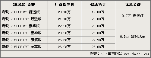 奇駿2010款新車在10月28日正式上市銷售,新款在外觀、配置等方面進行了一些列升級,但是價格并沒有做出任何調整。根據網上車市價格監測顯示,目前購買2010款奇駿可享受9000元的現金優惠,但低配車型現車緊張需預訂,具體參考如下:
