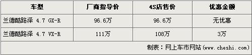 據經銷商銷售人員介紹,豐田-蘭德酷路澤分為4.0L和4.7L兩種排量,由于4.0L車型的尾氣排放是歐III標準,沒有達到北京施行的歐IV標準,所以北京限賣,店內沒有4.0L車型。4.7L車型分為GX-R版和VX-R版,目前購買蘭德酷路澤的消費者可以得到6萬元的優惠。經優惠后,蘭德酷路澤VX-R版售價降到了108萬元。
