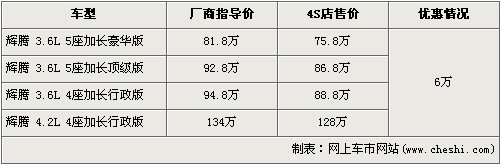 據北京進口大眾經銷店銷售人員介紹,目前輝騰全系有6萬元的現金優惠,經優惠后3.6L 5座加長豪華版的售價降到了75.8萬元。排量稍大的4.2L 4座加長行政版經優惠后售價從134萬元下降到了128萬元。銷售人員還介紹,4.2L輝騰沒有現車,欲購買的消費者需交訂金10萬元預訂。