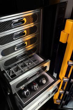 蘭博基尼特別版保險箱內部擁有很多分層,可以方便、安全的存放不同的物品。如果您是蘭博基尼的車主,在配一款如此特別的保險箱,必然會非常惹人羨慕。不過,及時你將貴重的鐘表、首飾及珠寶等物品放入其中,您也仍然可以放心的駕駛自己的愛車去遠郊兜風。