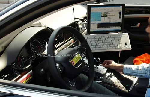 最近諜照記者設法拍到了奧迪新一代A8的內裝照片。雖然這輛測試車的內裝混合了現行版和下一代車型的內裝配置,但仍能看出新車采用了新的方向盤,經過升級的儀表群以及造型古怪的變速桿,它或許可以提供包括自動泊車等先進功能。測試人員右側放置的電腦顯示了新車正在測試的是車輛監測技術,該技術利用攝像頭和傳感器來探測車輛是否處于可能與其他車輛發生碰撞的危險環境中。