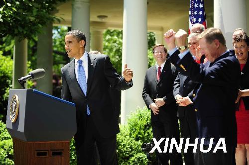 5月19日,美國總統(tǒng)奧巴馬在首都華盛頓白宮玫瑰園發(fā)表講話,福特汽車公司首席執(zhí)行官阿蘭·穆拉利(前右)在一旁舉手歡呼。當(dāng)日,奧巴馬宣布一項新的針對小型汽車和輕型卡車的排放標(biāo)準(zhǔn)和油耗標(biāo)準(zhǔn),該標(biāo)準(zhǔn)將于2012年起開始實施。根據(jù)要求,到2016年小型汽車和輕型卡車的平均能耗將達(dá)到每加侖汽油行駛35.5英里(即每100公里耗油約8升)。 新華社記者張巖攝