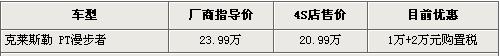 筆者從克萊斯勒北京地區(qū)經(jīng)銷商處了解到,目前PT漫步者這款車只有一款車型在售,售價(jià)為23.99萬元,現(xiàn)階段購車的話可以贈(zèng)送2萬元購置稅,同時(shí)4S店內(nèi)可以有1萬元的現(xiàn)金優(yōu)惠,優(yōu)惠后售價(jià)近21萬元。在顏色方面,這款車有黑色、銀色、紅色、藍(lán)色、灰色等多款可供消費(fèi)者選擇,目前4S店內(nèi)顏色不太齊全,個(gè)別款還需要消費(fèi)者預(yù)定。