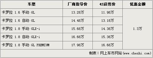 卡羅拉是一汽豐田07年推出的主力經(jīng)濟型轎車,此車全系共有5款車型,排量分為1.6L、1.8L,價格區(qū)間為13.28萬元-17.98萬元。近日根據(jù)網(wǎng)上車市價格監(jiān)測系統(tǒng)顯示,卡羅拉全系優(yōu)惠1.3萬元,最低售價不足12萬元,具體詳情請看下表: