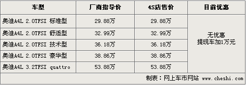 筆者從北京地區經銷商處了解到,目前奧迪A4L現車供應比較緊張,現車數量非常少,款式主要集中在2.0T舒適版和3.2兩款車,各4S店供車情況有一定差異。部分店提現車仍然需要加1萬元現金,或者在店內做1萬元裝飾。消費者如果訂車的話,需要交5000元左右訂金,等待一個月時間提車。
