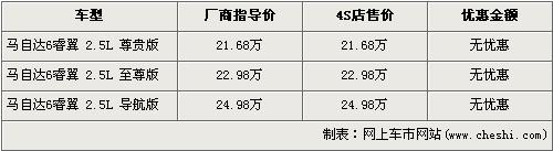 據北京一汽馬自達經銷店銷售人員介紹,馬自達6睿翼此次上市的車型分為售價21.68萬元的2.5L尊貴版,售價為22.98萬元的2.5L至尊版和售價為24.98萬元的2.5L導航版三款車型。目前店內可以接受馬自達6睿翼的購買訂單,訂金為2000元,并且可以無理由全額退還。消費者還介紹,目前店內已經到有至尊版展車供消費者品賞,第一批現車最早會在4月底到達經銷店。