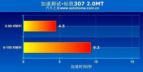 不過單憑2.0L的發動機我們很難相信標致307的表現會如此接近速騰冠軍版,車重應該也是關鍵因素之一,要知道冠軍版速騰的重量達到了1.4噸,而標致307最重的也才1.3噸出頭,這使其有能力在與速騰冠軍版的加速比拼中望其項背。而在實際測試中我們發現,307的5速手動變速箱也拖累了它的成績,由于換擋行程不夠緊湊,導致307在換擋時動力銜接不夠順暢,損失了部分時間,但不管怎么說,9.3秒的成績還是相當有說服力的,值得推薦。
