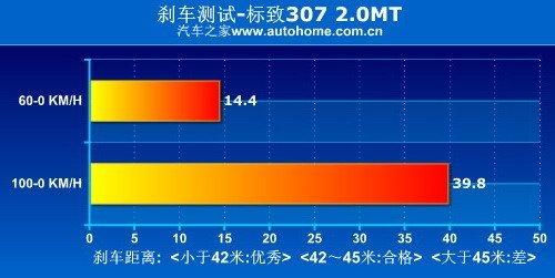 標致307沒有裝備什么特殊的剎車系統,也沒有速騰冠軍版那樣的寬胎,但剎車成績還是不錯的,39.8米比我們定義的優秀剎車距離最高線42米要短不少,而且在連續剎車測試中,剎車系統和輪胎的熱衰性控制的很好,基本沒有出現因過熱而增大距離的情況。只是由于307的懸掛調教偏軟,全力制動時前懸掛被壓縮到極致,后輪幾乎沒有附著力,此時車輛穩定性比較令人擔憂。
