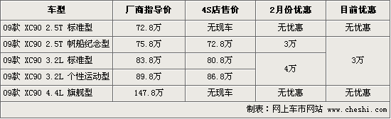 據(jù)沃爾沃4S店銷售人員介紹,目前銷售的沃爾沃XC90均是09款新車,其中2.5T帆船紀(jì)念版車型和3.2兩個排量車型可優(yōu)惠現(xiàn)金3萬元,其他2.5T標(biāo)準(zhǔn)版和4.4旗艦版沒有優(yōu)惠。現(xiàn)車方面,4S店有藍色款現(xiàn)車供應(yīng),個別款顏色需要消費者先行預(yù)定。