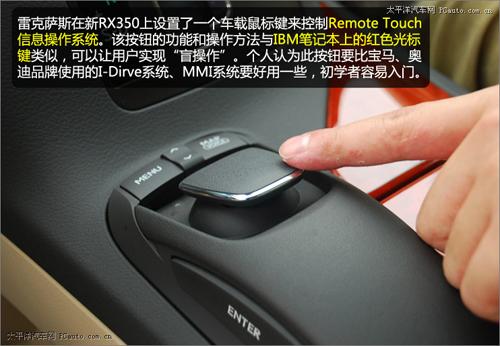 雷克薩斯在新RX350上設置了一個車載鼠標鍵來控制最新的Remote Touch信息操作系統。該按鈕的功能和操作方法與IBM筆記本上的紅色光標鍵類似,可以讓用戶實現“盲操作”。只需輕輕擺動該按鈕,車載電腦屏幕上的鼠標鍵便會按照指示移動。個人認為此按鈕要比寶馬、奧迪品牌使用的I-Dirve系統、MMI系統好用一些,初學者也容易入門。據悉,這套控制系統將逐步推廣到雷克薩斯全系車型上。