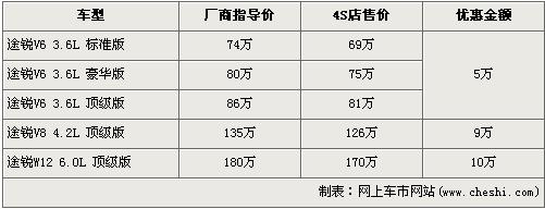 據經銷商銷售人員介紹,目前店內途銳全系均有不同優惠,最高讓利達到了10萬元。搭載V6發動機的3.6L車型優惠現金5萬元,3.6L車型經優惠后售價分別為:標準型69萬元,豪華型75萬元,頂級型81萬元;搭載V8發動機的3.6L頂級型經9萬元優惠后售價降到了126萬元;搭載W12發動機的全系頂配車型6.0L頂級版經10萬元的優惠后售價從180萬降到了170萬元。