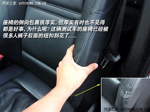 前排座椅的包裹性非常出色,特別是靠背兩側的包裹隆起很高,但我們也發現這種座椅的一點不足之處:側面很容易被褲子后兜的紐扣刮到,時間稍長就成了試駕車現在的樣子:真皮已經被刮花了。