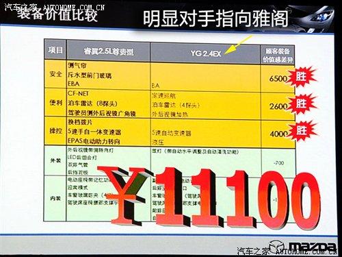 此次上市發(fā)布會(huì)上面一汽馬自達(dá)將自己的配置和同級(jí)別車型進(jìn)行了對(duì)比,公開發(fā)布了同級(jí)別售價(jià)的車型相比睿翼在配置方面的性價(jià)比會(huì)高出1.11萬元的口號(hào),并且現(xiàn)場(chǎng)用PPT進(jìn)行了展示。