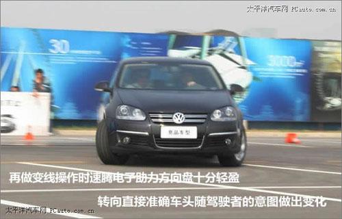 首先我們將速騰加速到80公里/小時,油門到底,車猛的竄了出去,再做變線操作時,電子助力方向盤十分輕盈,轉向直接準確,車頭隨駕駛者的意圖做出變化,只是在做出太大動作時,速騰的轉向不足的情況比較嚴重。在整個過程中速騰底盤表現出深厚的功底,“駕駛者之車”的美譽名副其實。