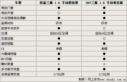 由于兩款車型都是1.6的高配車型,多以在配置方面比較全面。電動門窗、外后鏡電動調節、遙控鑰匙和后排座椅放倒功能都是它們的標配。不僅這樣,它們還配備了一些中高級轎車才配備的冷藏功能手套箱和自動雙區空調。但是仔細看下來各兩款車型還是各自都有各自的特點,雪鐵龍世嘉三廂配備了定速巡航,可以大大減少駕駛員長途駕駛的疲勞。標致307則配備了電動天窗。在音響方面,307的8揚聲器可以讓乘客更好的體會到音樂的樂趣。兩款車型都配備了方向盤音響調節功能。