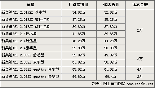 據(jù)4S店銷售人員介紹,目前新奧迪A6L現(xiàn)售的車型主要是黑色款,其他款顏色如銀色均需要預(yù)訂。訂金為1萬元,需要等待兩個月時間。消費者現(xiàn)在購車可以享受一定的現(xiàn)金優(yōu)惠幅度,其中2.0、2.4和3.0排量優(yōu)惠2萬元。2.8舒適型和豪華型優(yōu)惠3萬,2.8頂配車型可優(yōu)惠到4萬。