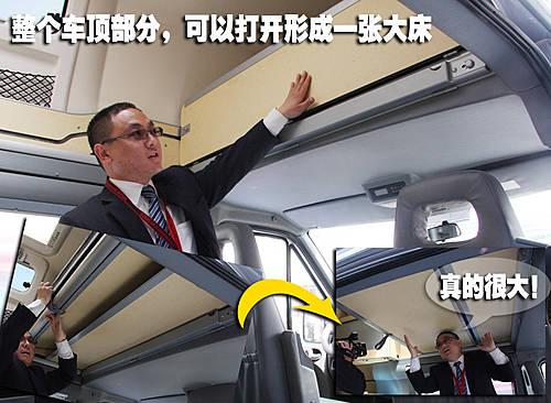上面圖片中工作人員正在向記者演示隱藏在車頂的雙人床,在平時這張雙人床是隱藏的看不見的。此時在車輛中后部都可以擁有非常不錯的縱向空間,即便身高在1.8米以上的乘員也不會感覺到頭頂的壓抑。