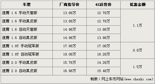 據(jù)北京一汽大眾經(jīng)銷店銷售人員介紹,在上海車展上亮相的速騰1.4TSI最早預(yù)計(jì)將在6月上市銷售,預(yù)售價格可能不會低于16萬元,此車的上市將會取代目前在售的速騰2.0升自動擋車型。近期購買速騰在售車型的消費(fèi)者都可以得到不同程度的優(yōu)惠,速騰1.6L車型優(yōu)惠1.1萬元,1.8T冠軍版車型優(yōu)惠8000元,2.0L車型優(yōu)惠金額達(dá)到了全新最高的1.5萬元,但是2.0L車型目前店內(nèi)無現(xiàn)車,預(yù)購買者需交訂金1000元,約等一周后可提車。