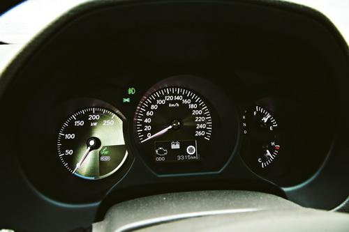 由于使用了電動機系統,GS450h的儀表盤并沒有設置發動機轉速表,取而代之的一個功率表,隨時顯示電動機的瞬時輸出功率;至于中間的車速表和右邊的綜合信息表在所有車型上則都是一樣的。GS系列車型儀表盤另一個特點就是具有ECD電子色控裝置,能夠根據照射在儀表盤上的光線強度自動調節自身亮度,保證駕駛員能夠清晰地讀取數據——安全實用的配置。