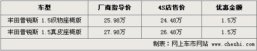 據(jù)4S店銷售人員介紹,目前普銳斯全系有兩款車在售,售價(jià)分別為25.98萬和27.98萬元,現(xiàn)在購車的話可以優(yōu)惠現(xiàn)金1.5萬元。款式和顏色不太齊全,訂車的話周期比較長(zhǎng),需等大概2個(gè)月時(shí)間。