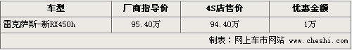 據(jù)雷克薩斯4S店銷售人員表示,剛剛上市的RX450h的貨源相對(duì)比較緊張,所以優(yōu)惠幅度也是最少的,只有1萬(wàn)元。個(gè)別款色需要消費(fèi)者提前預(yù)訂才行。