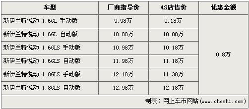 據北京現代經銷商處銷售人員介紹,新伊蘭特悅動全系車型優惠8000元,經優惠后全系入門級的1.6L GL手動版的售價為9.18萬元,是全系的最低價格。銷售人員還介紹,1.6L車型現車充足,而1.8L車型店內現車有限顏色不全,欲購買無現車的1.8L車型消費者需交納3000元現金,等一周后可提車。