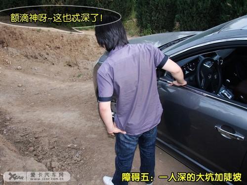 最后,來到此次試駕難度最高的障礙,一人深的大坑讓人望而卻步,下車觀察一番發現上坡路面松軟并且坡度不小,考量一番,制定了下坡慢、上坡快的方案,控制速度緩慢接近坑底,首先讓車頭慢慢順上陡坡,此時逐漸加大油門幫助車輛迅速脫離陡坡,個別車輪空轉時有發生,好在合理的車速和充沛的低扭使車輛頑強的通過了最后的考驗。