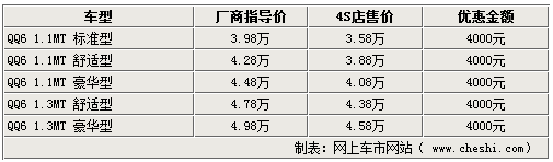 據銷售人員介紹,奇瑞QQ3系列車型比較齊全,只有1.1AMT車型現車較少。但目前QQ3全系都有一定的優惠幅度,除現車較少的車型需要提前預訂以外,全系車型均可以優惠4000元。