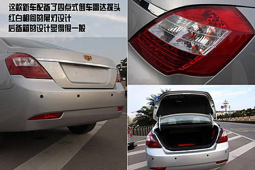 帝豪EC718的尾部設(shè)計(jì)也非常漂亮,線條流暢,造型也比較新穎。尤其是尾燈和霧燈的設(shè)計(jì),看上去更加成熟、穩(wěn)重。而這款新車尾部配備了四點(diǎn)式倒車?yán)走_(dá)探頭,后排氣管采用隱藏式設(shè)計(jì)。后備箱的設(shè)計(jì)比較一般,開口寬度不是很大,而且尾門支撐并沒有采用液壓挺桿。