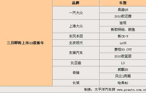 春節過后,是各車企正式在新的一年里開始上演新車部署好戲的開始。今日,編輯搜集了13款即將在3月先后上市的新車消息,其中有合資品牌重磅車型北京現代ix35、國產Q5和上海大眾途觀等,還有以威麟X5為主的6款自主品牌車型,下面為網友重點介紹其中8款新車: