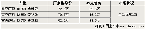 據北京雷克薩斯4S店銷售人員透露,目前初低配版本的RX350典雅版車型的貨源相對比較緊張,其余兩款車型的貨源充足,只是個別顏色需要預定,訂貨周期在10個工作日左右。現在購車在可以得到3萬元的現金優惠還,還可以得到商家贈送的簡單裝飾。