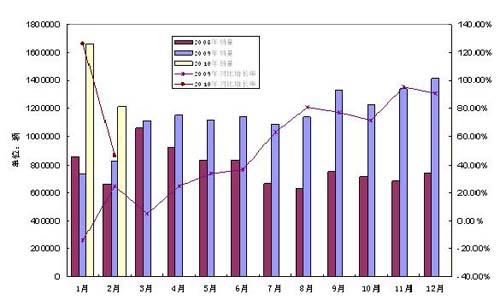 2月,轎車(chē)產(chǎn)銷(xiāo)分別為61.83萬(wàn)輛和62.31萬(wàn)輛,分別比同期增長(zhǎng)48.17%和45.88%。1-2月,轎車(chē)的產(chǎn)銷(xiāo)分別為148.14萬(wàn)輛和155.33萬(wàn)輛,分別比同期增長(zhǎng)88.52%和79.31%。其中,自主品牌轎車(chē)?yán)塾?jì)銷(xiāo)售52.51萬(wàn)輛,占轎車(chē)銷(xiāo)售總量的33.81%,比2009年所占比例提升了4.14個(gè)百分點(diǎn)。
