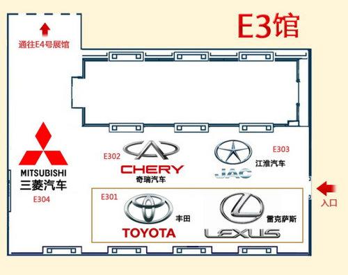 在本屆北京車(chē)展,E3館有奇瑞汽車(chē)、豐田、雷克薩斯、江淮、三菱等5個(gè)品牌參展。亮點(diǎn)車(chē)型:豐田新銳志、豐田新款卡羅拉、雷克薩斯LFA、三菱RVR、奇瑞新款A(yù)5等。