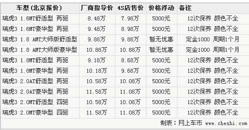 由于瑞虎大師版車型剛剛上市,4S店還沒有現車銷售,消費者如果想預訂此車型需要交納1000元定金,預計提車周期在1個月左右。雖然大師版沒有現車也暫無優惠,但是4S店表示現在購買瑞虎3的其他車型,可享受4000元現金優惠,還可以贈送一些裝飾,目前車型顏色并不齊全,白色均無現車需要預定。