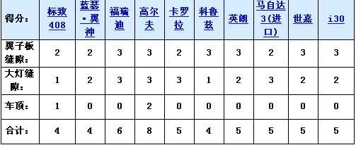 2、發動機蓋與大燈的接縫。十款車相比的話,縫隙較小的3分;有些車縫隙中有密封條,視為縫隙較小;縫隙一般大的得2分,縫隙較大的得1分。