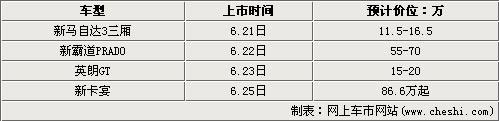 6月21日來自長安馬自達(dá)的馬自達(dá)3三廂車型將會(huì)亮相一個(gè)小改款車型,在外形上這款“新”馬自達(dá)3與老款車型區(qū)別并不大,沒有改變成為進(jìn)口馬自達(dá)3車型的全新外觀,但是整車配置方面有所提升。6.22日的時(shí)候國產(chǎn)豐田越野車PRADO俗稱霸道將會(huì)推出全新一代產(chǎn)品,新款PRADO外形和內(nèi)飾上都會(huì)相比老款車型有明顯的提升,而唯一令人期待的就是它的價(jià)格了。6月23日別克的三廂緊湊型轎車英朗GT將會(huì)正式上市發(fā)布價(jià)格,而據(jù)別克內(nèi)部人士透露英朗GT的定位可能并不會(huì)太低,因此期待英朗GT定出較低價(jià)位的朋友到時(shí)候可是要重點(diǎn)的關(guān)注一下了。最后一款是保時(shí)捷在中國持續(xù)大賣的豪華SUV卡宴,據(jù)說新的卡宴在北京車展亮相之后就已經(jīng)接到了非常多的訂單,僅北京就接近200臺(tái)的預(yù)定數(shù)量,那么如果您也希望購買保時(shí)捷新卡宴,真的要提早的去經(jīng)銷商那里提交一份訂單了。