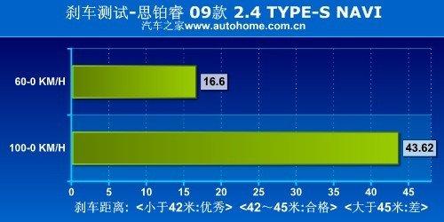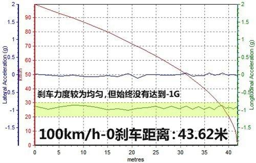 思鉑睿的剎車帶有鮮明的本田特色,踏板的前段制動力比較弱,在末段的時候又會感覺車輛有前竄的特性,所以剎車力度需要短時間適應才能掌握。最終我們測試思鉑睿的剎車成績為43.62米,表現一般。