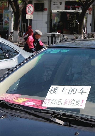 “毀車者自重、剁手自負!”昨天,東城區東四北大街43號一輛掛著警示牌的“牛車”引得路人駐足觀看、拍照。車主金先生說,放狠話是因為他的車在停車場多次被劃,希望以此嚇退劃車人。