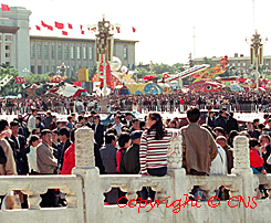 參加50年國慶游行的大型彩車擺放在天安門廣場上,十月二日數以萬計的游人從北京各處涌向這里,一睹節日廣場的風采。