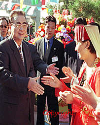 全國人大常委會委員長李鵬(左)十月二日在中山公園參加國慶五十周年游園活動 時,與少數民族代表親切握手。