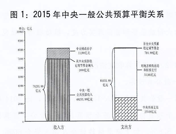 中央一般公共預算收入69233.99億元,為預算的100%,增長7%。加上從中央預算穩定調節基金調入1000億元,收入總量為70233.99億元。中央一般公共預算支出80730億元(其中,中央本級支出25549億元,中央對地方稅收返還和轉移支付55181億元),完成預算的99.1%,增長8.6%。加上補充中央預算穩定調節基金703.99億元,支出總量為81433.99億元。收支總量相抵,中央財政赤字11200億元,與預算持平。2015年末,中央財政國債余額106599.59億元,控制在年度預算限額111908.35億元以內;中央預算穩定調節基金余額1156.37億元。