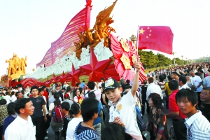 “黃金周”期間,天安門廣場人流如織,中外游客超過820萬人次,超過2008年國慶黃金周北京接待的游客總人數。北京市旅游局統計,北京203個主要景點接待游客的總量突破了950萬人次。