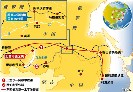 中俄油管可被視作俄羅斯東西伯利亞-太平洋石油管道一期工程伸向中俄邊境的支線,從阿穆爾州的斯科沃羅季諾出發,抵達中俄邊境。進入中方境內后,最終與石油重鎮大慶相連。