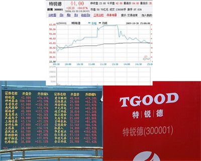 青島特銳德被眾多媒體稱為“創業板第一股”,第一家上會、第一家審核通過、第一個發布招股書、并獲得創業板001號證券代碼。今天,特銳德收盤于44元,較發行價上漲約85%。當初投資特銳德的7名自然人其身價都已過億。
