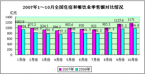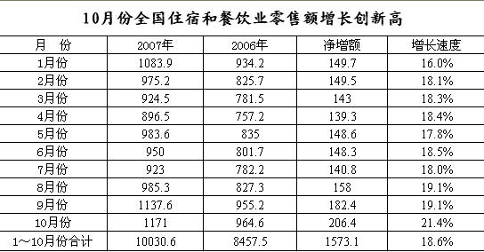 今年1-10月份,全國住宿與餐飲業(yè)零售額累計實現(xiàn)10030.6億元,同比增長18.6%,比去年同期增幅高出2.4個百分點,占社會消費品零售總額的13.9%,拉動社會消費品零售總額增長2.5個百分點,對社會消費品零售總額的增長貢獻(xiàn)率為15.7%。