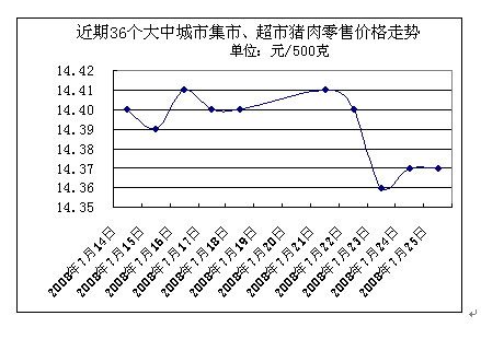 中新網7月28日電 國家發改委網站消息,據國家發展改革委價格監測中心監測,上周(2008.7.21-2008.7.25,下同)全國36個大中城市集市、超市豬肉(精瘦肉)平均零售價格每500克為14.38元,與前一周(2008.7.14-2008.7.18,下同)相比下降0.13%。