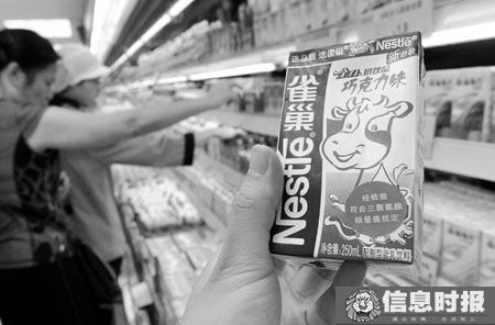 在家樂福超市萬國廣場店,記者看到光明純牛奶250毫升裝悄然回歸賣場;在吉之島超市天河城店,記者看到,昨日還未貼上綠簽的雀巢巧克力味和草莓味的配制型含乳飲料,昨日悄然換新裝。其生產日期標注為“2008年6月6日”,早于9月14日這一“分水嶺”。同時,記者在7-11便利店天河南店也看到了雀巢這兩款配制型含乳飲料重新擺上貨架售賣。
