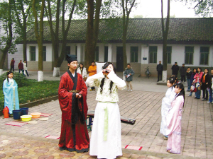 迎賓、洗爵、行拜禮……昨下午,在西南大學蜀園的孔子像前,20多個學生進行了“鄉飲酒禮”儀式。他們分別扮成主人和賓客,“賓客”將酒杯舉在腰間,向“主人”鞠兩躬,“主人”作揖還禮后,“賓客”再慢慢地將杯中的米酒喝下,為了表示對“主人”的尊敬,杯里的酒不能全部喝完。隨后,他們還齊聲朗誦了《關雎》、《鹿鳴》等《詩經》中的名篇。整個儀式持續了近2個小時,將這一古老儀式的12個步驟演繹得十分逼真。