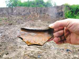 聞訊趕來的南京市博物館考古隊員在挖塌的斷壁泥土中隨便撥弄,就找到幾塊碎陶片。“你看,這塊是黑陶、這塊是夾砂紅陶,從陶片看,這個器皿不小,上面還有不是很規則的戳印紋。”記者仔細一看,上面刻的紋飾非常精美。一位考古專家說,此次經過考古勘探,郭家山坑商周時期古文化遺址長220米,寬120米左右,面積達到2.3萬平方米。從斷面上可見大量紅燒土層及紅陶、灰陶片,其中可辨器有罐、鬲、鼎等。據悉,考古人員在這個文化遺址上一共探測到了8個文化層,最底層則是3000多年前的商周文化層。
